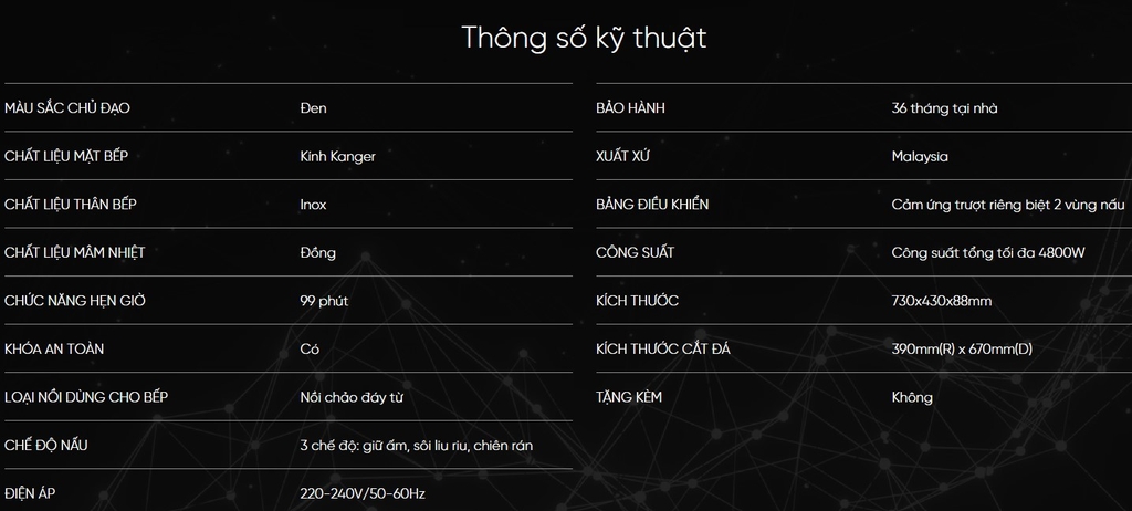 Với tổng mức công suất là 4800W, công suất mỗi vùng là 2400W, chế độ Booster sẽ giúp gia tăng công suất bếp lên mức cực đại trong thời gian ngắn, giúp tiết kiệm tối đa thời gian nấu nướng