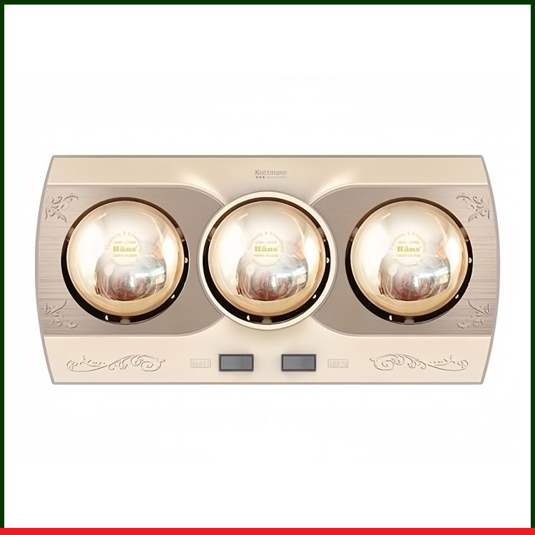 Đèn sưởi nhà tắm Kottmann 3 bóng vàng K3B-Q Với thiết kế hoa năm tinh tế sang trọng màu vàng kim hòa quyện cùng màu trắng bạc tạo cho đèn sưởi Kottmann 2 bóng vàng một diện mạo hòan toàn mới phù hợp với không gian phòng tắm sang trọng và đạt chuẩn phong cách Châu Âu.Hơn nữa, Đèn sưởi nhà tắm Kottmann 3 bóng K3B-Q còn sử dụng tia hồng ngoại làm ấm tức thì, giúp làm phòng tắm của gia đình bạn trở nên ấm áp chỉ trong khoảnh khắc, không tốn nhiều thời gian chờ đợi. Với sự tích hợp các công nghệ hiện đại, Đèn sưởi Kottmann 3 bóng vàng không gây cảm giác khô da, không đốt cháy oxy… như một số loại đèn sưởi nhà tắm thông thường.Đèn sưởi nhà tắm Kottmann K3B-Q còn giúp làm giảm các triệu chứng đau, sưng, phù nề, bầm,tím, khớp, gout, chứng căng thẳng, mệt mỏi…, tăng cường trao đổi chất, kích thích sinh trưởng tế bào, kích thích tuần hòan máu, cho bạn cảm giá sảng khoái, khỏe mạnh khi bước vào phòng tắm.