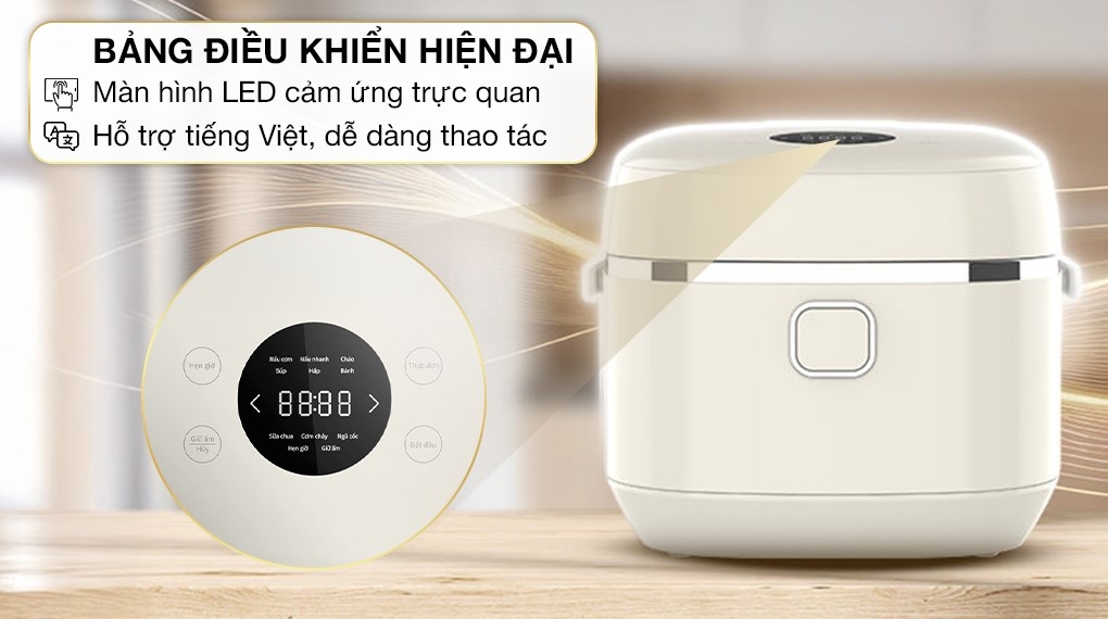 Bảng điều khiển cảm ứng kết hợp màn hình LED rõ nét, giao diện tiếng Việt trực quan giúp người dùng dễ dàng thao tác, lựa chọn chế độ nấu và theo dõi thời gian một cách thuận tiện.