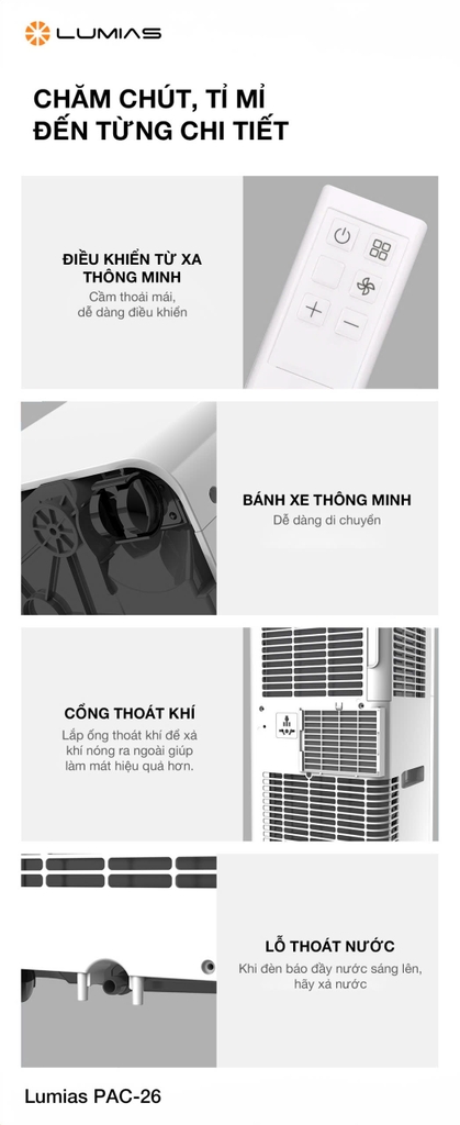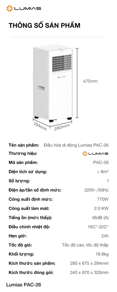 Với khả năng làm mát linh hoạt, kết nối thông minh, vận hành êm ái và thiết kế tiện lợi, Lumias PAC-26 là giải pháp hoàn hảo để bạn tận hưởng không khí mát lành mọi lúc, mọi nơi – từ căn hộ nhỏ đến không gian tổ chức sự kiện ngoài trời.