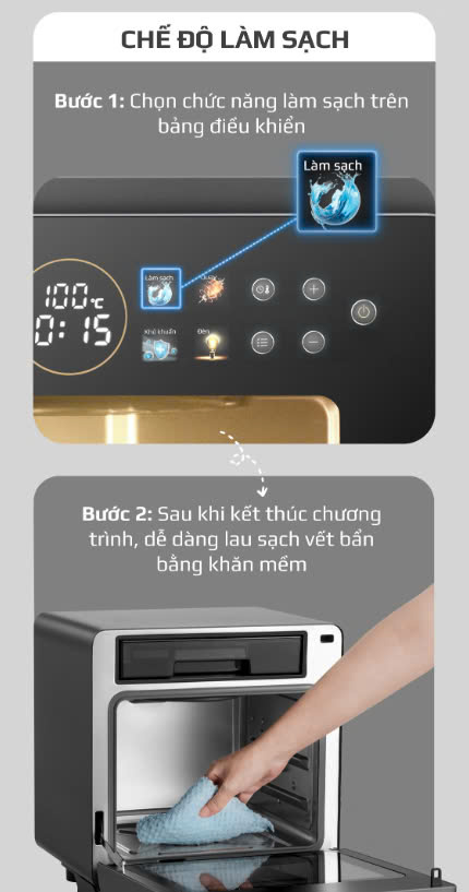 ✔️ Chức năng Làm sạch - Khử khuẩn: tận dụng hơi nước siêu nhiệt làm mềm các vết bám bẩn, dầu mỡ trên thành nồi sẽ được làm mềm, có thể lau sạch dễ dàng.