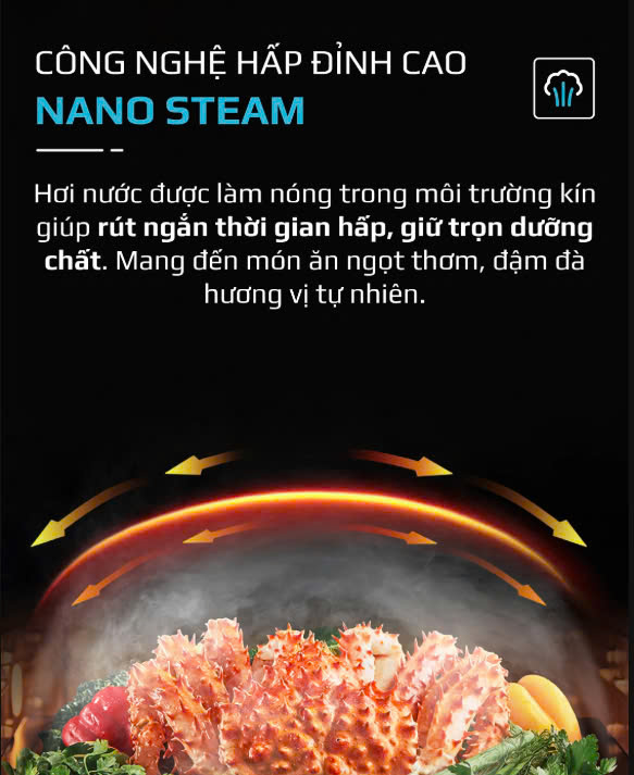 ✔️ Công nghệ hấp đỉnh cao Nano Steam: giữ trọn hương vị và dinh dưỡng, mềm ngon không bị dai, đa dạng chế biến.