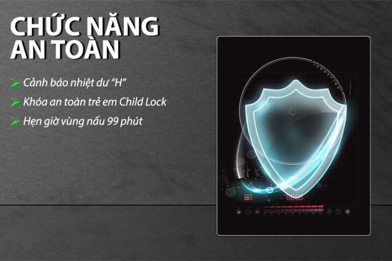 Khóa phím trẻ em: Khi kích hoạt chế độ khóa phím trẻ em thì toàn bộ bảng điều khiển sẽ được ẩn đi. Chức năng này giúp ngăn ngừa trẻ nhỏ có vô tình chạm tay vào bếp thì cũng không điều khiển được. Khi bạn muốn điều khiển lại bếp thì phải mở khóa trên bảng điều khiển. Hoặc chọn lại vùng nấu với chế độ tự động khóa.