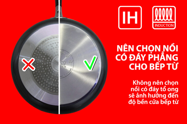 Nên lựa chọn nồi chảo kích thước phù hợp, bề mặt đáy bằng phẳng, không lồi lõm cong vênh. Không sử dụng nồi chảo mà dưới đáy có gắn một lớp đục lỗ hình chấm bị sẽ làm ảnh hưởng đến hiệu suất của bếp và độ bền của mặt kính.