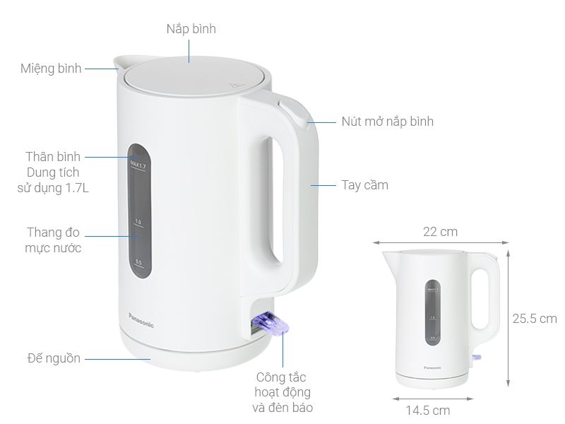 Bình đun siêu tốc Panasonic NC-K101WRA có dung tích 1.7 lít, công suất 1850W - 2200W, tự ngắt điện khi nước sôi, có lưới lọc cặn tiện lợi,... đáp ứng tốt nhu cầu sử dụng nước nóng trong việc pha trà, cà phê, nấu mì,...
