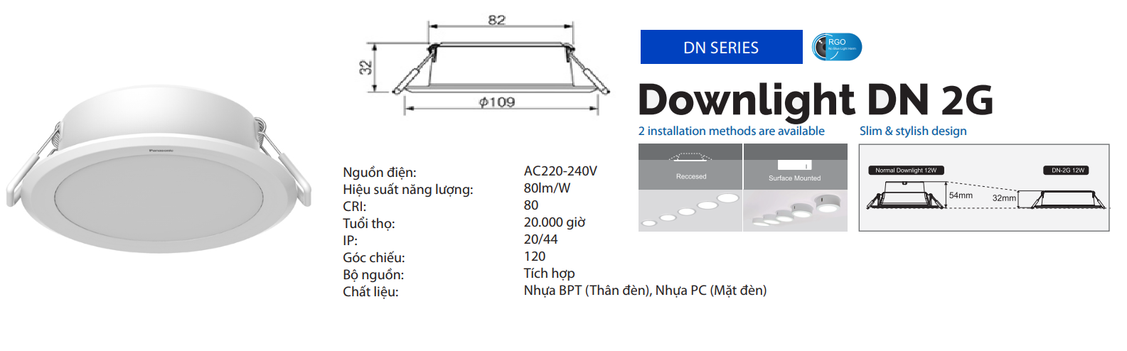 Đèn LED âm trần Panasonic DN Series 2G thế hệ mới còn có thể lắp nổi linh hoạt nhờ vào phụ kiện khung gắn nổi mua thêm, linh hoạt trong thiết kế