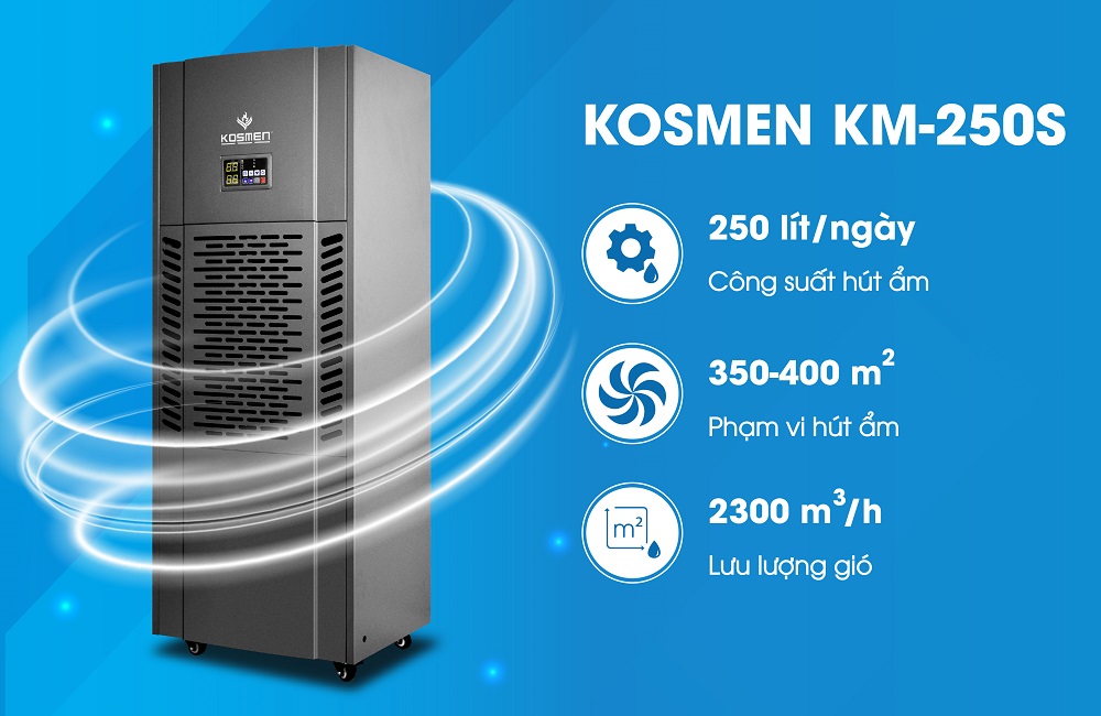 Sở hữu công suất hút ẩm lên đến 250 lít/ngày, máy hút ẩm Kosmen KM-250S có thể hút ẩm hiệu quả trong không gian lớn với phạm vi từ 350 - 400m2. Với công suất hút ẩm này, máy có thể ứng dụng trong nhiều không gian rộng cần được tách ẩm như kho, xưởng, bệnh viện, khách sạn, trường học, nhà hàng,...