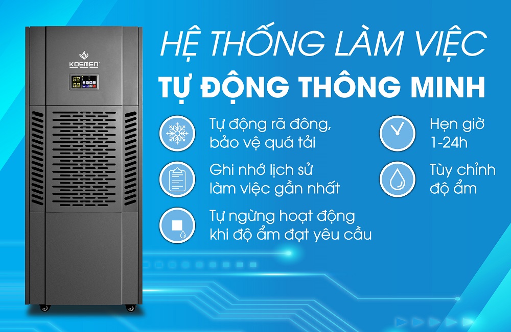 Cũng giống các sản phẩm khử ẩm khác của Kosmen, máy hút ẩm Kosmen KM-250S được trang bị nhiều cơ chế vận hành tự động giúp đơn giản hóa quá trình sử dụng và thao tác cho người dùng. Các tính năng như chế độ hút ẩm thoải mái, sấy khô liên tục, tăng/giảm độ ẩm theo yêu cầu,... được tích hợp sẵn trên bảng điều khiển giúp người dùng dễ dàng vận hành máy theo nhu cầu sử dụng của mình. Với độ ồn tối đa chỉ 64dB, Kosmen KM-250S có thể hoạt động vô cùng êm ái mà không phát ra âm thanh lớn, tạo cảm giác thoải mái cho người sử dụng.