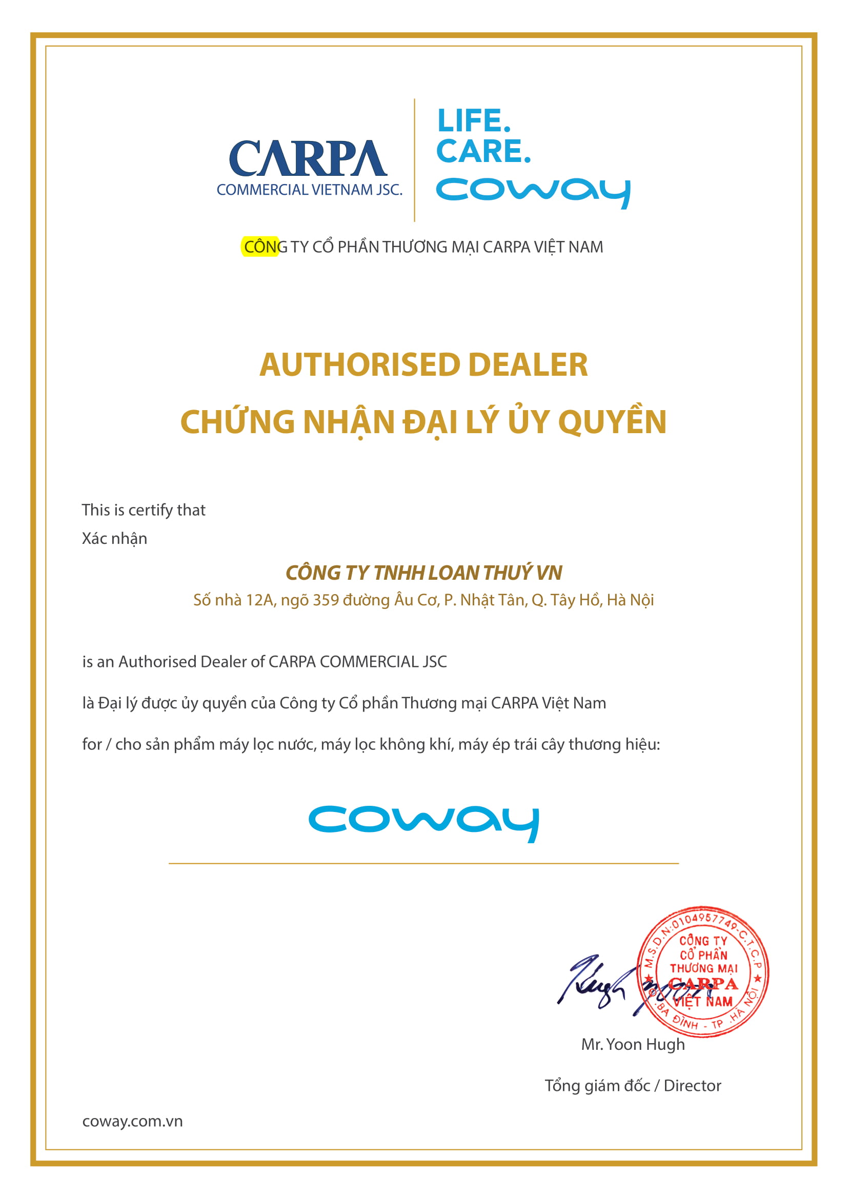 Hướng dẫn thanh toán: Hiện nay, quý khách có thể thanh toán cho CÔNG TY TNHH LOAN THUÝ qua 5 hình thức: 1. Thanh toán trực tiếp: - Áp dụng với những đơn hàng có địa chỉ giao hàng nội, ngoại thành Hà Nội. - Sau khi kiểm tra và nhận hàng, quý khách thanh toán trực tiếp bằng tiền mặt cho nhân viên giao vận. 2. Thanh toán tại cửa hàng - Khách hàng có thể đến tham quan, mua sắm tại cửa hàng, đặt mua và thanh toán hóa đơn ngay tại cửa hàng sau đó trực tiếp mang sản phẩm về hoặc yêu cầu giao hàng tận nhà theo qui định và chính sách của ĐIỆN MÁY TÂY HỒ. 3. Thanh toán qua nhà xe khi gửi hàng qua xe. - Khách hàng có thể nhờ chủ nhà xe thanh toán tiền toàn bộ đơn hàng khi nhân viên của CÔNG TY TNHH LOAN THUÝ mang hàng ra nhà xe gửi cho khách hàng. 4. Thanh toán qua công ty vận chuyển - Đối với các đơn hàng ở các tỉnh thành khác, khách hàng có thể thanh toán qua công ty vận chuyển khi công ty vận chuyển hàng hóa giao hàng tận nhà cho khách hàng. 5. Thanh toán chuyển khoản:. - Chuyển khoản qua số tài khoản: Số tài khoản: 0931004203681 Tên chủ tài khoản: Công ty TNHH Loan Thúy VN Tại: Ngân hàng TMCP Ngoại Thương Hà Nội (Vietcombank) - CN Hoàng Mai (Hà Nội) |