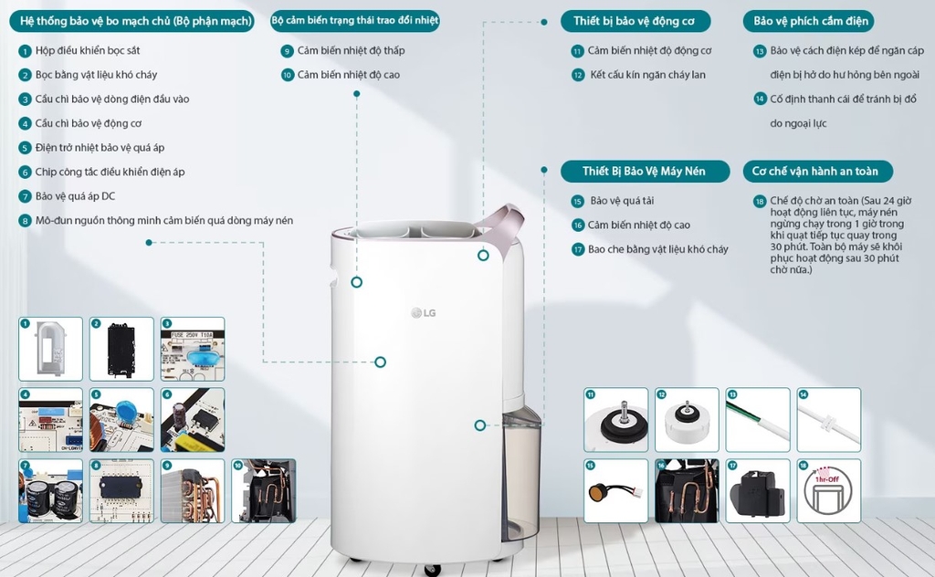 Máy nén quyết định hiệu quả hoạt động, hiệu suất và độ ồn của máy hút ẩm. Máy nén biến tần kép của LG tiết kiệm năng lượng hiệu quả, đem lại hiệu suất mạnh mẽ, độ ồn thấp và cực kỳ bền bỉ.