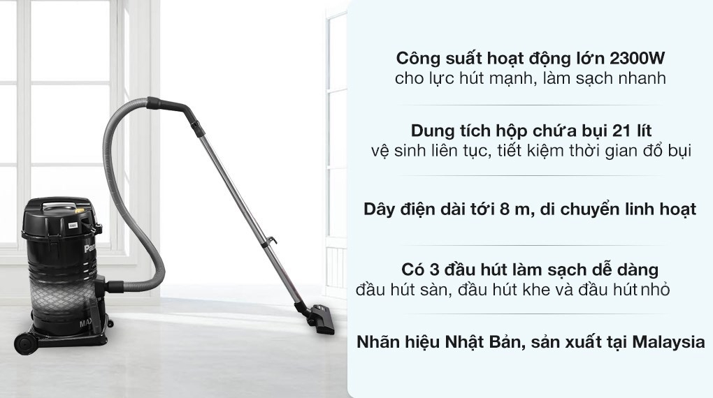 Hút Bụi Panasonic với thùng chứa bụi dung tích lớn 21L giúp bạn hút bụi lâu hơn mà không phải xả giữa chừng, dễ dàng tháo rời và giặt giũ khi cần thiết.