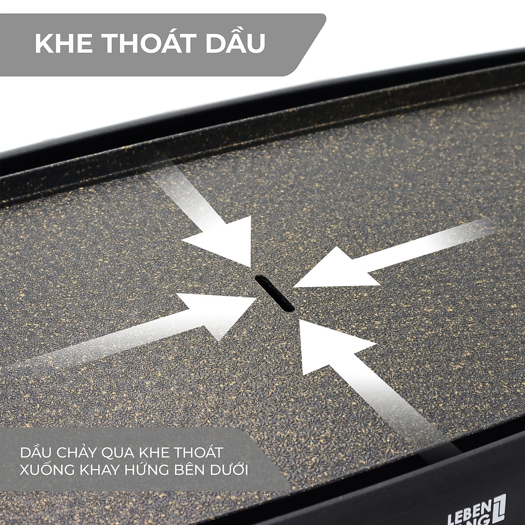 Bề mặt Bếp Nướng Điện LBDD5656 Không Khói Lebenlang có lỗ thoát dầu và bên dưới Bếp có ngăn hứng dầu, giúp dễ dàng loại bỏ dầu mỡ thừa khi đang nướng.