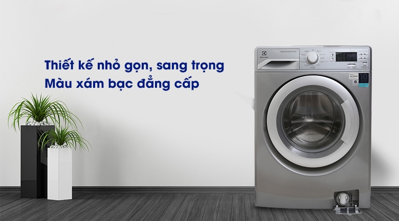 Máy giặt Electrolux Inverter 8 kg EWF12853S có thiết kế nhỏ gọn với đường nét tinh tế, màu xám bạc trang nhã giúp tiết kiệm diện tích và phù hợp với không gian nội thất sang trọng của gia đình bạn.