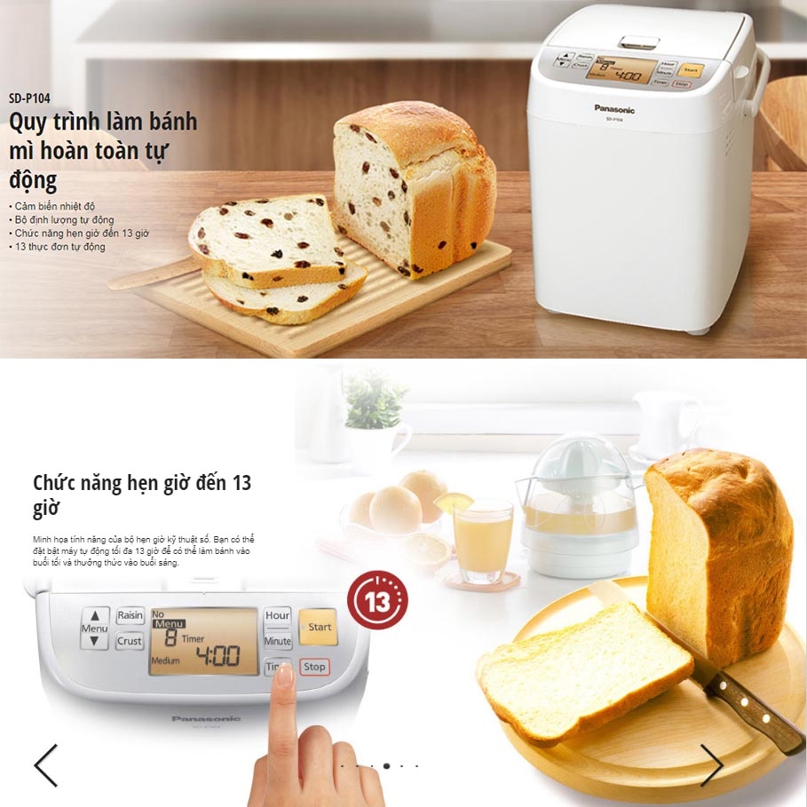 MÁY LÀM BÁNH MÌ Panasonic SD-P104WRA - CÔNG THỨC LÀM BÁNH MÌ SỐ 1 Khởi đầu một buổi sáng tràn đầy năng lượng và đầy đủ chất dinh dưỡng với những mẫu bánh mì nóng hổi giòn tan, kèm theo trứng ốp la, thịt bò, hay 1 cốc sữa thì thật là tuyệt vời. Máy làm bánh mì Panasonic SD-P104WRA hiện đại - công thức làm bánh mì nhanh, ngon, giòn, hợp vệ sinh của thuơng hiệu Panasonic nổi tiếng. Sản phẩm dễ sử dụng, được trang bị sẵn 13 menu với những tùy chọn phong phú và khả năng hẹn giờ lên tới 13 tiếng tiện lợi. Với thiết kế sang trọng, bền đẹp, máy làm bánh mì Panasonic SD-P104WRA trang trí gian bếp nhà bạn thêm hiện đại, đầy đủ tiện nghi.