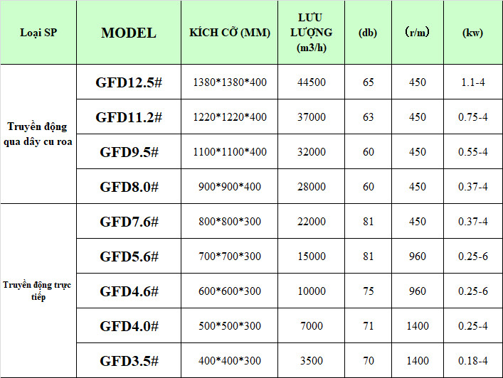 - Quạt sử dụng mô tơ truyền động trực tiếp và gián tiếp thông qua dây curoa
